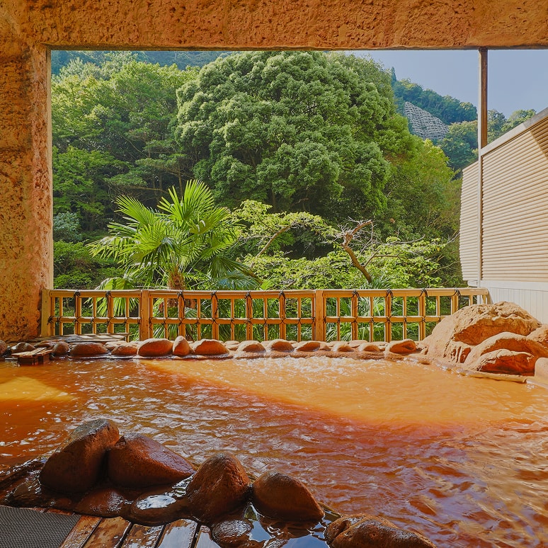 月光園の金泉は自家泉源。有馬でも数少ない、敷地内に泉源を持つ旅館です。日帰りでは絶景を眺めながら鴻朧館の金泉が楽しめるほかにも、3つの異なるテーマの貸切風呂(要予約)や姉妹館「游月山荘」の温泉もご堪能いただけます。