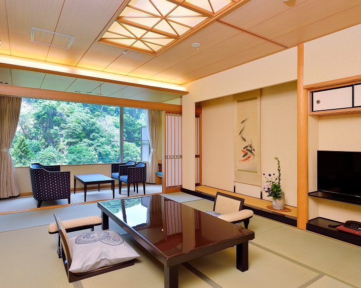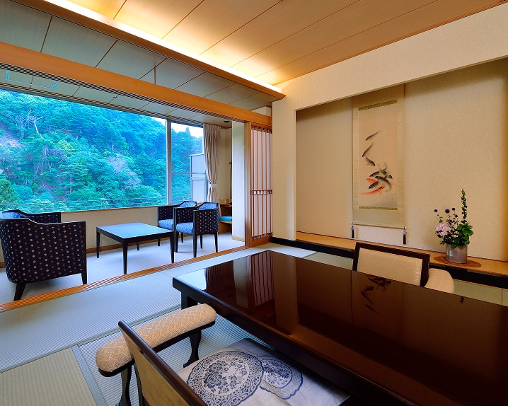 和室でゆったりとくつろぎながら、目に入るのは有馬三山の一つである「落葉山」の雄大な景色。