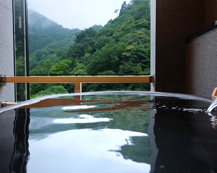 天然ラドンのお湯が注ぐ露天風呂に浸かりながら、目に入るのは有馬三山の一つである「落葉山」の雄大な景色。夏の新緑、秋の紅葉など四季折々の風景を、より間近にご体感いただけます。
