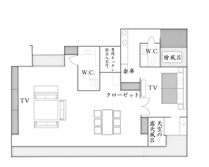 | 客室設備 | 60インチ薄型テレビ1台、48インチ薄型テレビ1台、インターネット、フリースポット接続可能 |
